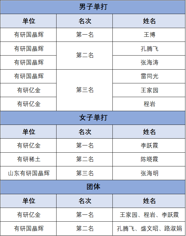 经过激烈的比赛,各项冠军纷纷出炉。有研亿金凭借出色的团队协作和实力夺得了团体赛桂冠,有研国晶辉王博和有研亿金李跃霞分别获得男子单打和女子单打冠军。