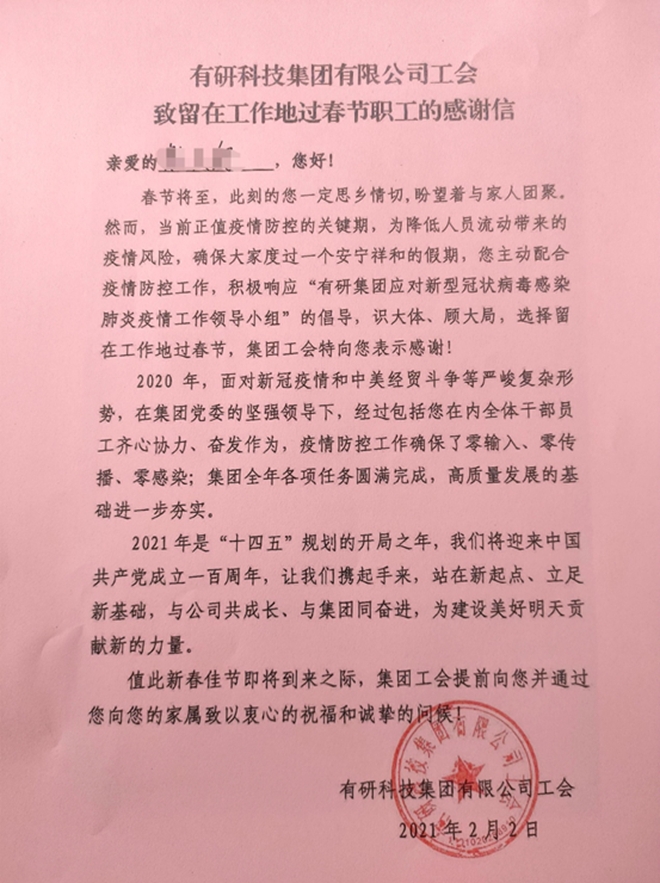 2021年春节假期,为配合国家疫情防控工作,有研集团广大职工积极响应,选择留在工作地过春节。为了让就地过年的职工度过一个有温度有意义的新春佳节,集团党委统一部署、精心组织,推出系列暖心举措。